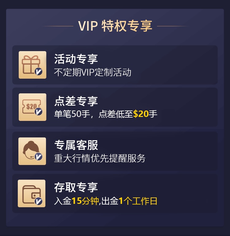 ① 账户由标准账户升级为VIP账户,享受$2/手VIP点差返还;
